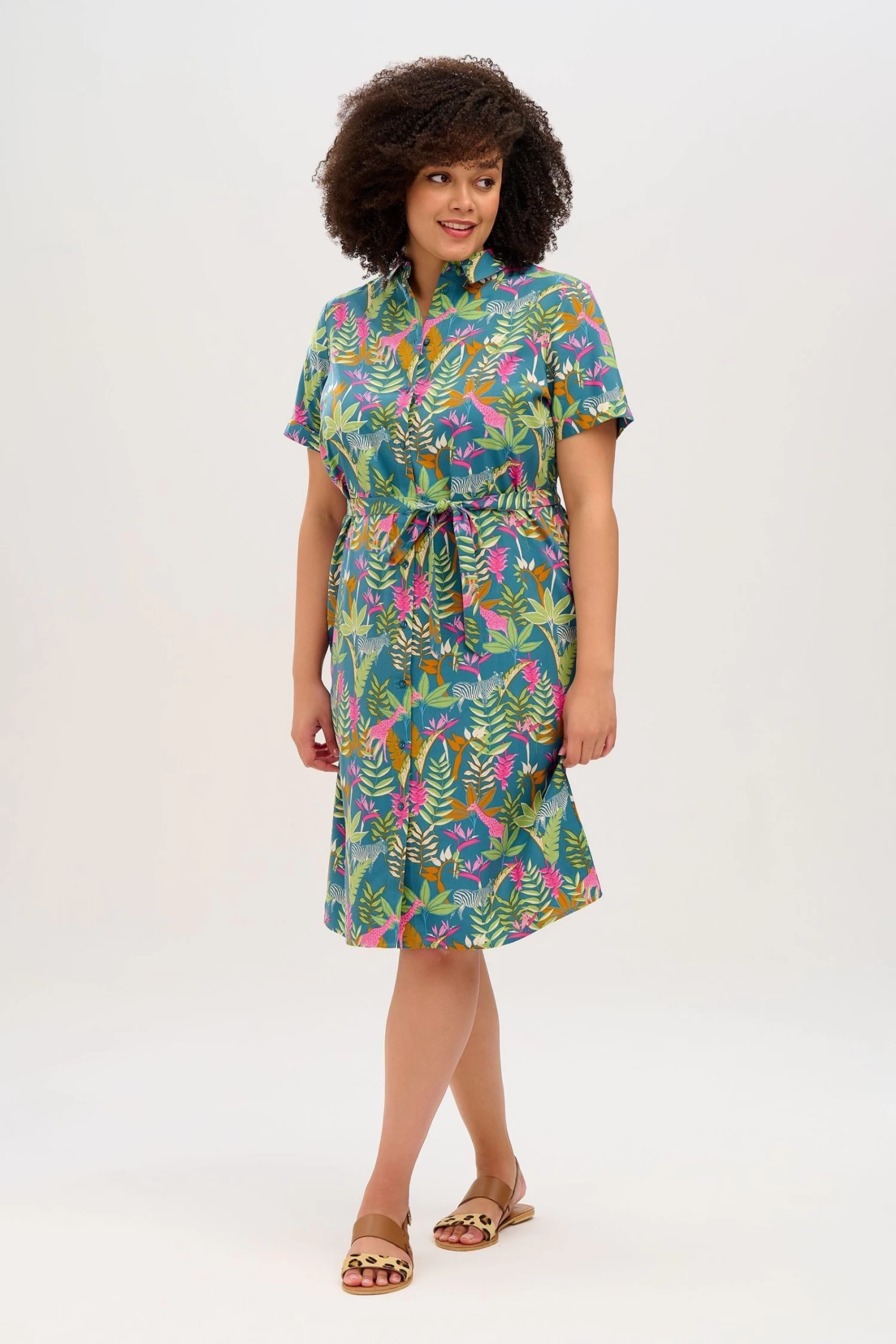 Who doesn’t love a shirt dress? This modern classic combines short sleeves, a tie waist and a slim longer length skirt with our vibrant Paradise Jungle print. This wildlife print was hand-drawn by our designer Olivia and features teal zebras and pink giraffes among tropical foliage.