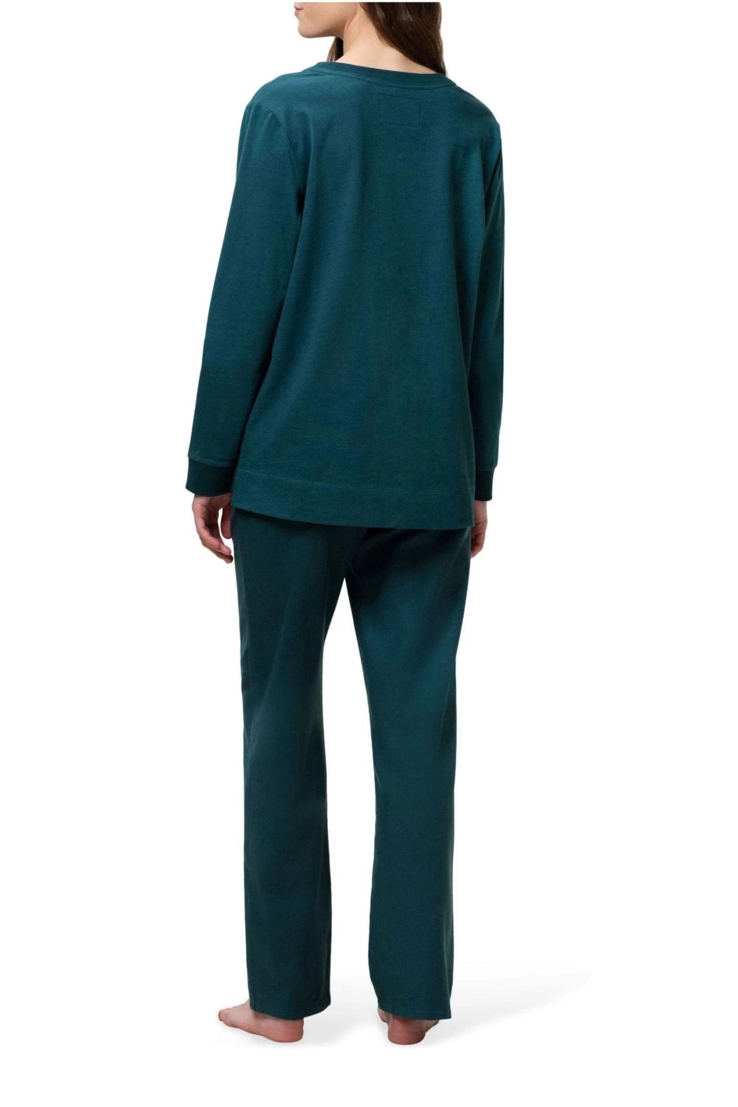 This warm pyjama set from the lounge-me cotton homewear range features a decorative seasonal motif on the front. Comfortable long-sleeved top and straight-cut long trousers with elastic waistband and side seam pockets. Seasonal design embellished with embroidery and glittery details. Made from warm and organic cotton fabrics.