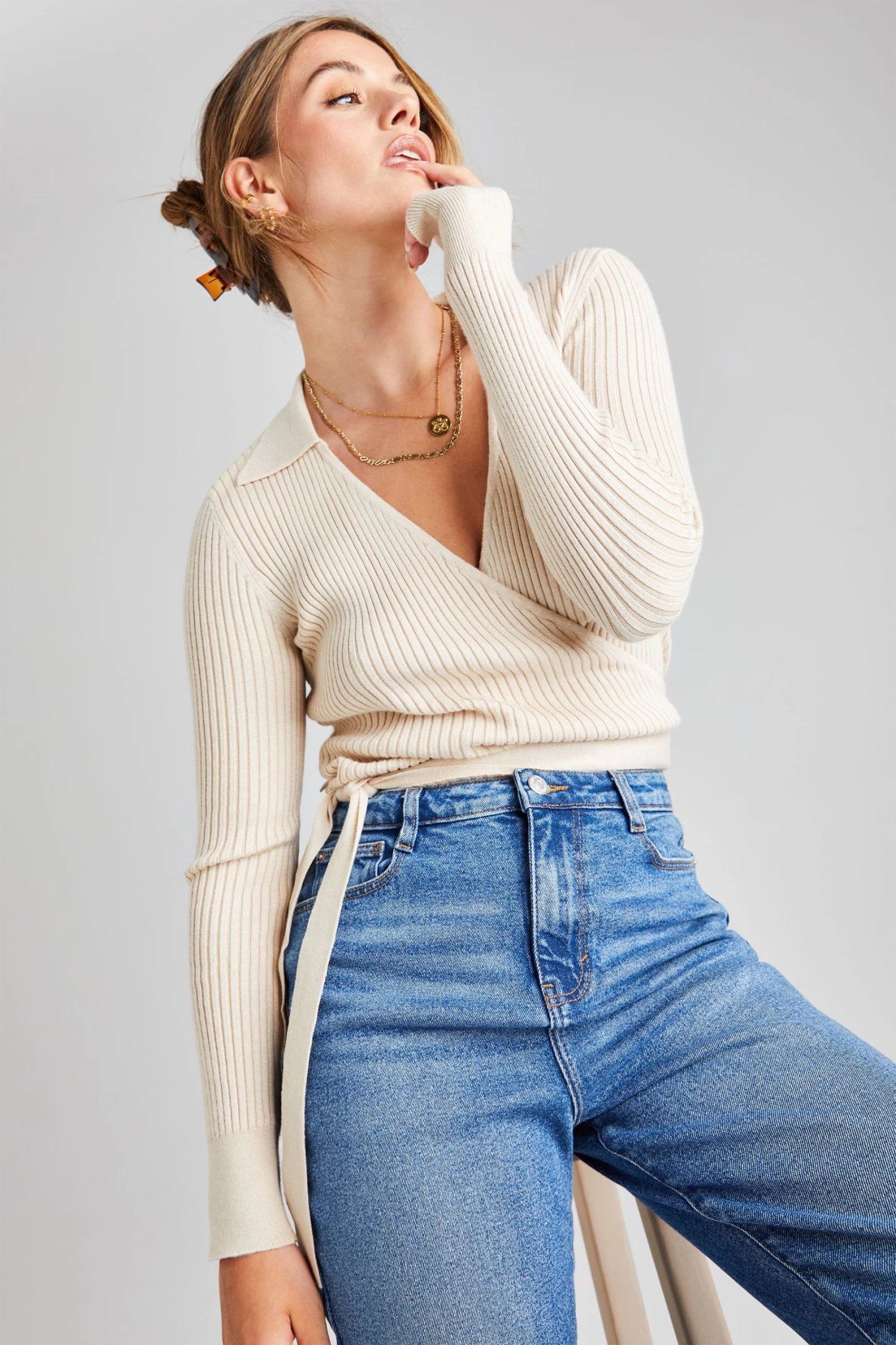 Make this wrap knit top a staple item in your wardrobe. Featuring collar detail, this top can be teamed with jeans and boots to complement or dressed up with our coated jean and heels.