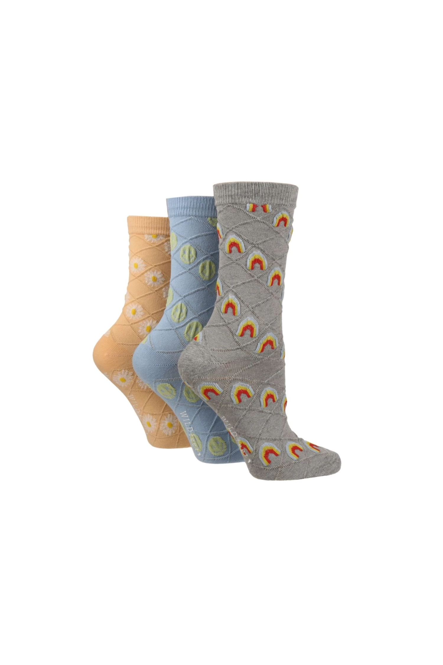 A brand new and completely fresh take on the well-loved novelty sock, Wildfeet s very simple goal in mind is to supply the world with a little piece of daily fun, happiness and enjoyment. This Multi Pack of Textured Socks are bang on trend, coupled with the cute little designs they make the perfect addition to anyones Spring Summer wardrobe . Knitted to a fine gauge from a soft cotton rich blend.