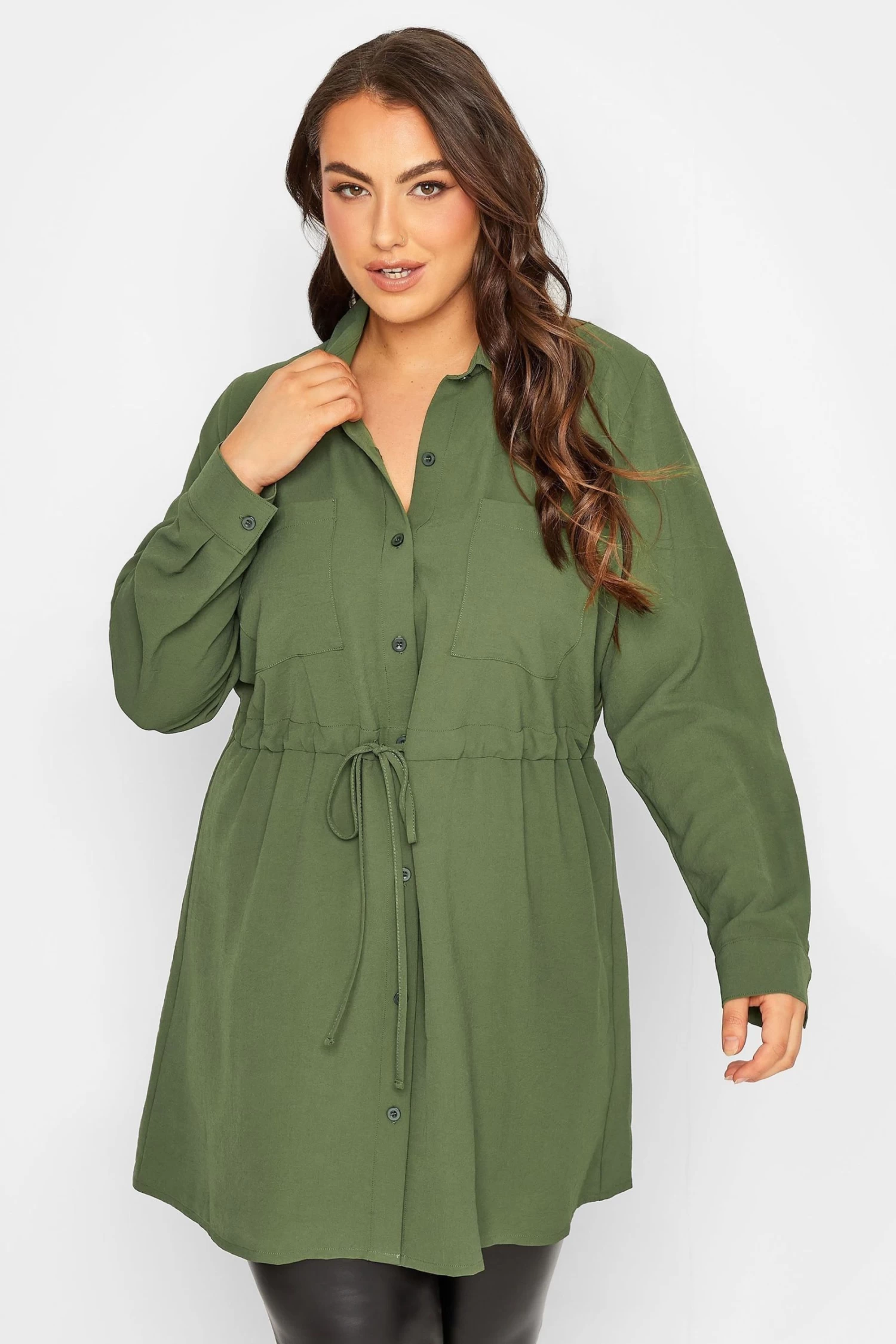 A must-have essential for your wardrobe Made from a comfortable woven fabric this shirt features 3/4 length sleeves a tie waist chest pockets and a classic collar. Style with leather leggings and black boots for a look youll feel confident in Why We Love It:Versatile for every occasion.