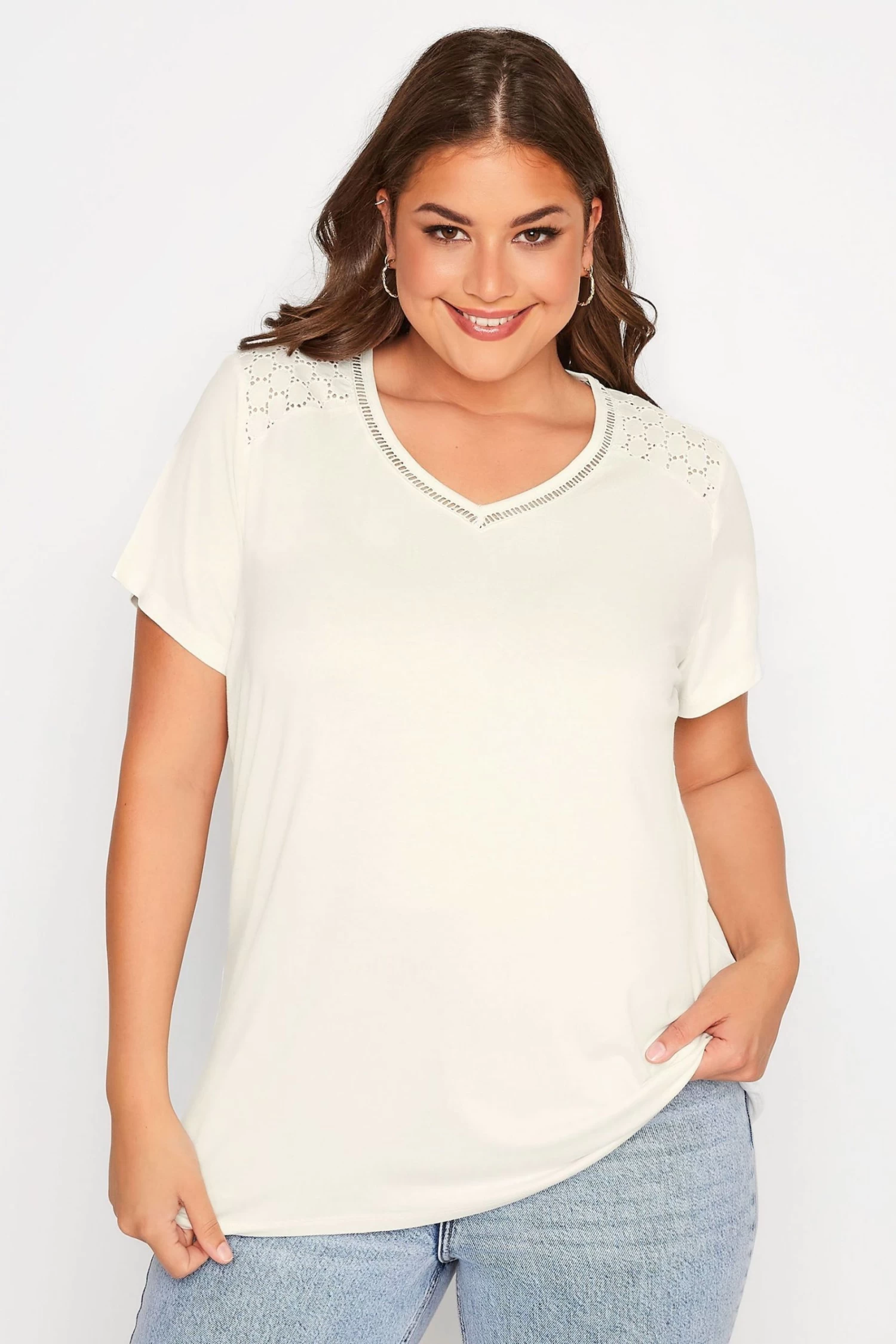 Refresh your top collection with this plus size t-shirt. Made from a stretch jersey fabric it features short sleeves, a v-neckline, a dipped hem, and is complete with an embroidered shoulder detail. Pair with your favourite jeans and trainers for an off-duty outfit. Why We Love It: Great for your everyday wardrobe. Length from approx: 80cm/31.5.