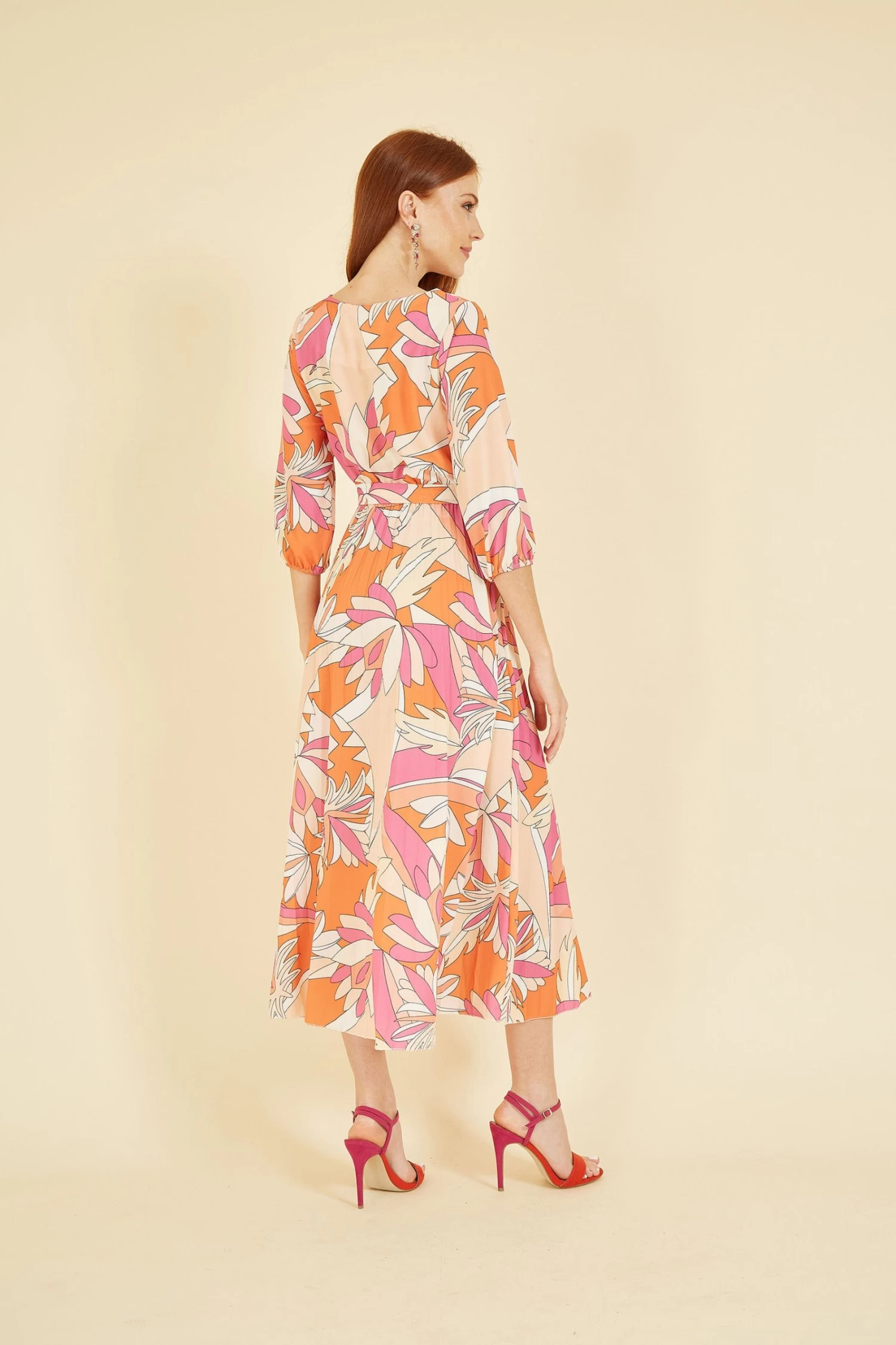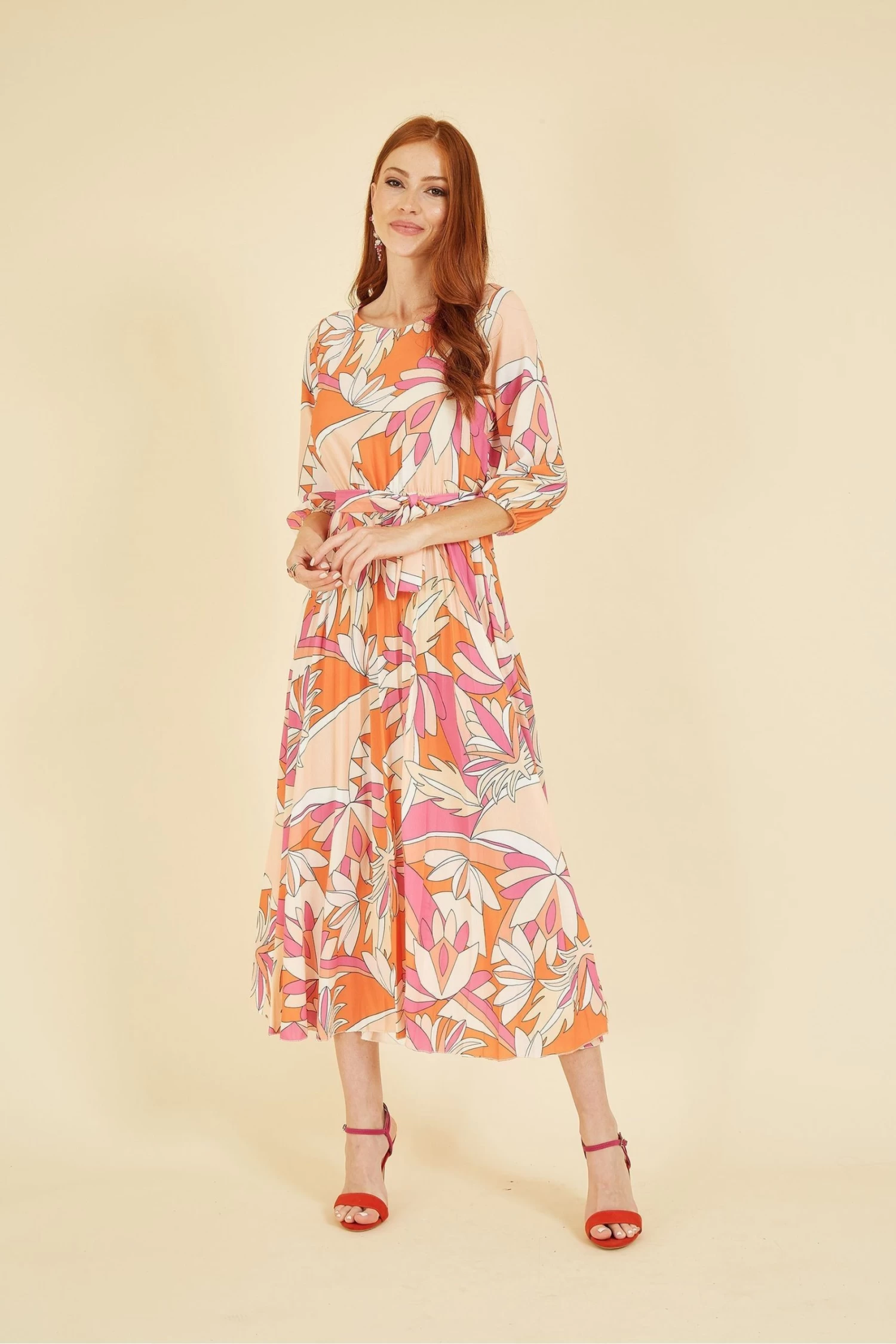 This Yumi midi dress is one for any occasion. The pleated skirt flows to the ankle, showcasing the unique abstract pattern all over the dress. With a 3/4 sleeve, self tie belt and round neckline, the overall shape of this piece is classic and elegant.