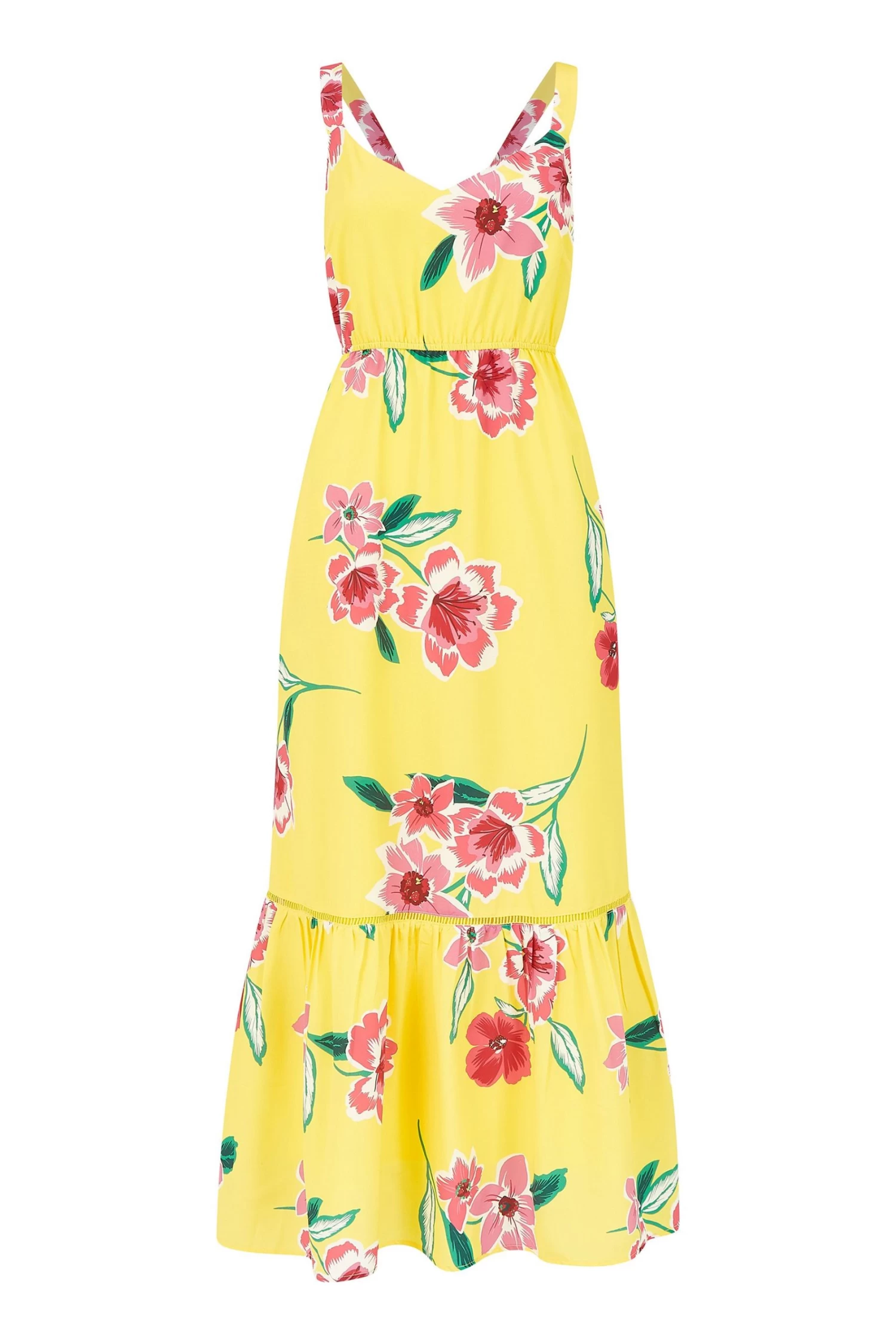 The yellow backdrop is enhanced with large pink and white flowers on this Yumi maxi dress. The simple strappy sleeves and v neckline showcase the print on this dress perfectly, The maxi skirt has a large frill detail at the bottom that adds movement.