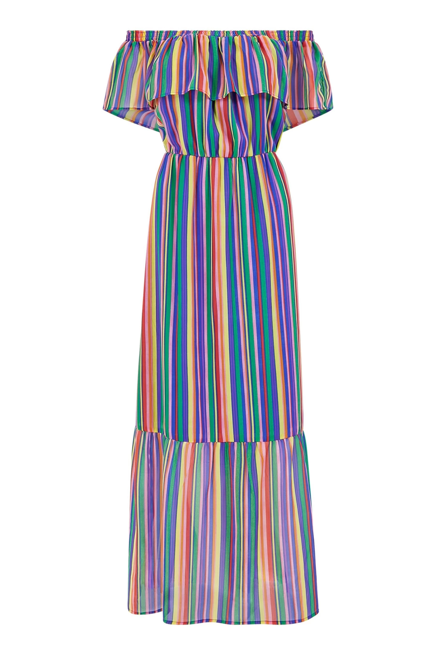 In an lightweight and flowing shape, this maxi dress is a must-have for the warm weather. Featuring a bardot neckline and a peplum hemline for balance, it s cut to a subtle fit and flare shape. Rainbow stripes offer a vibrant finish.