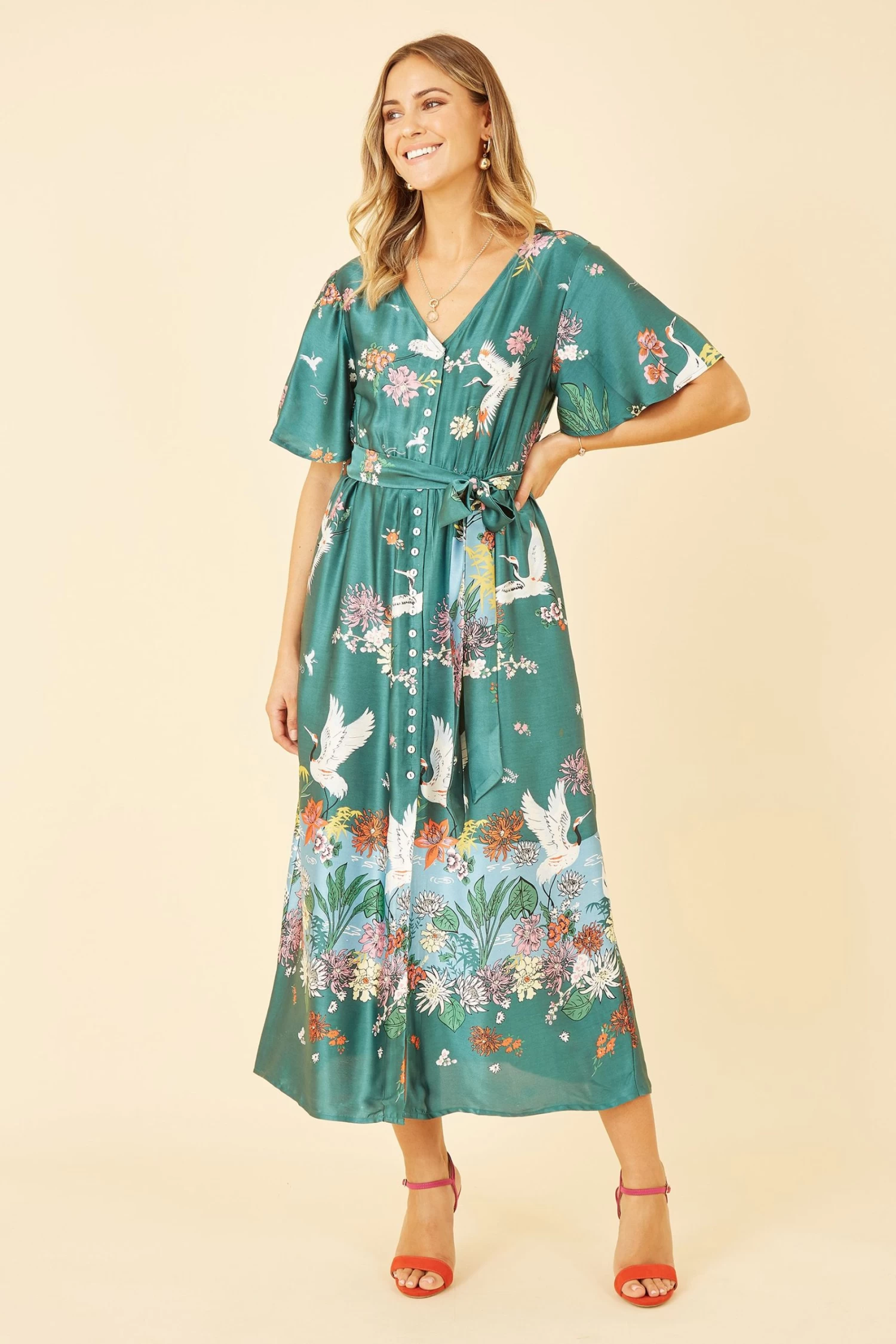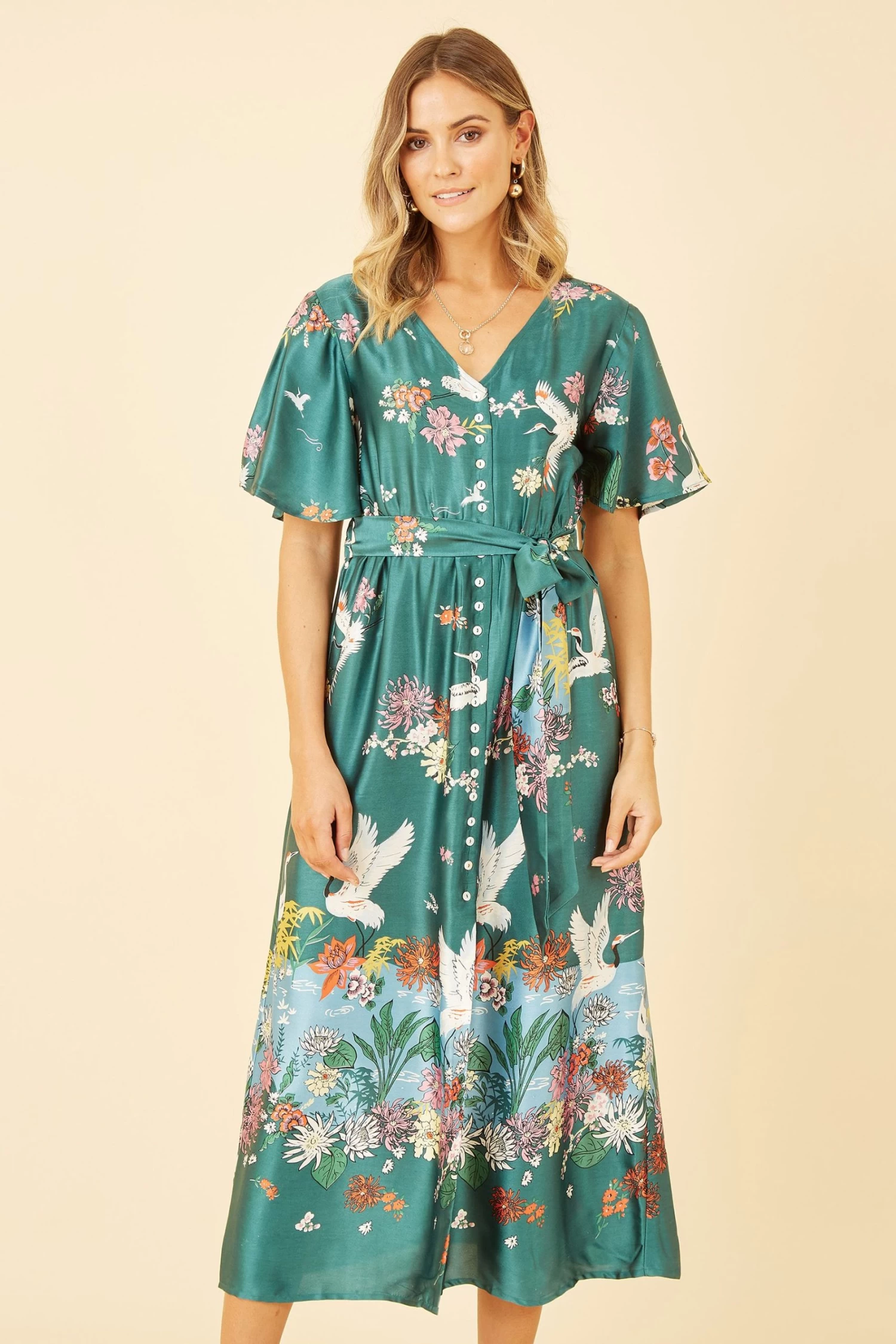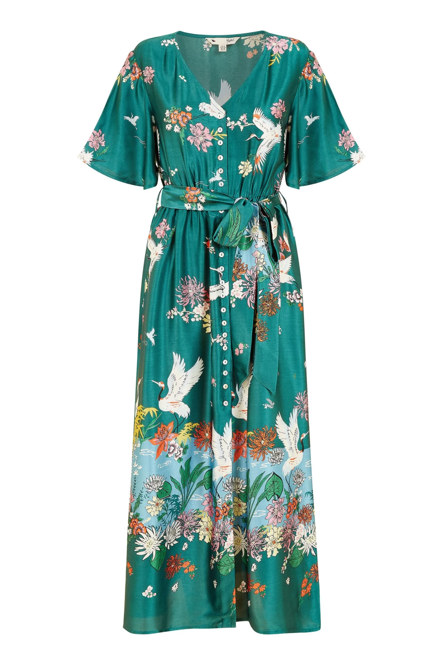 This Shirt Dress takes inspiration from the beauty found in nature. With the depiction of cranes and beautifully illustrated flowers and water at the hemline. Made from silky satin, in a button down design, the kimono sleeve and self tie waist balance the look.