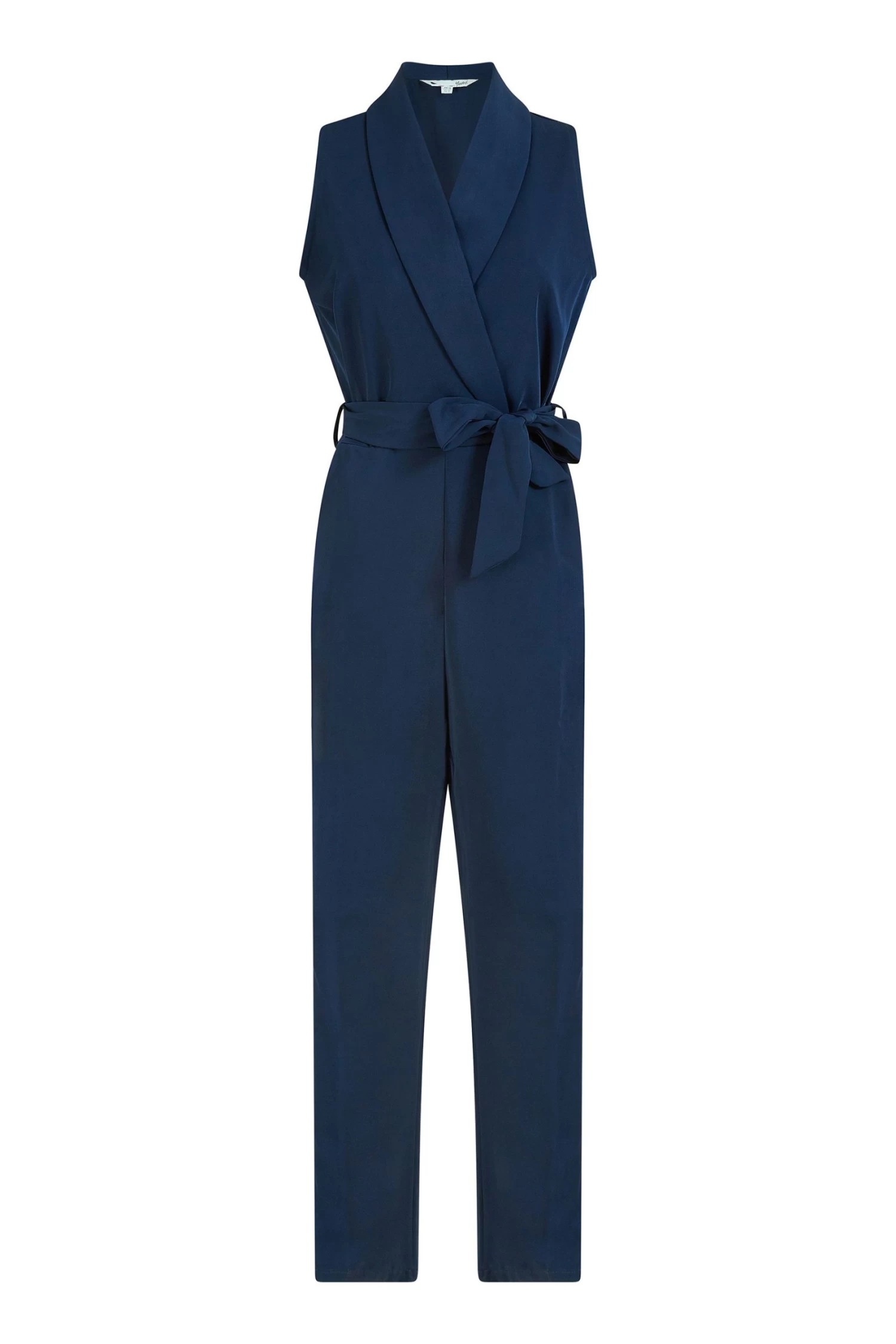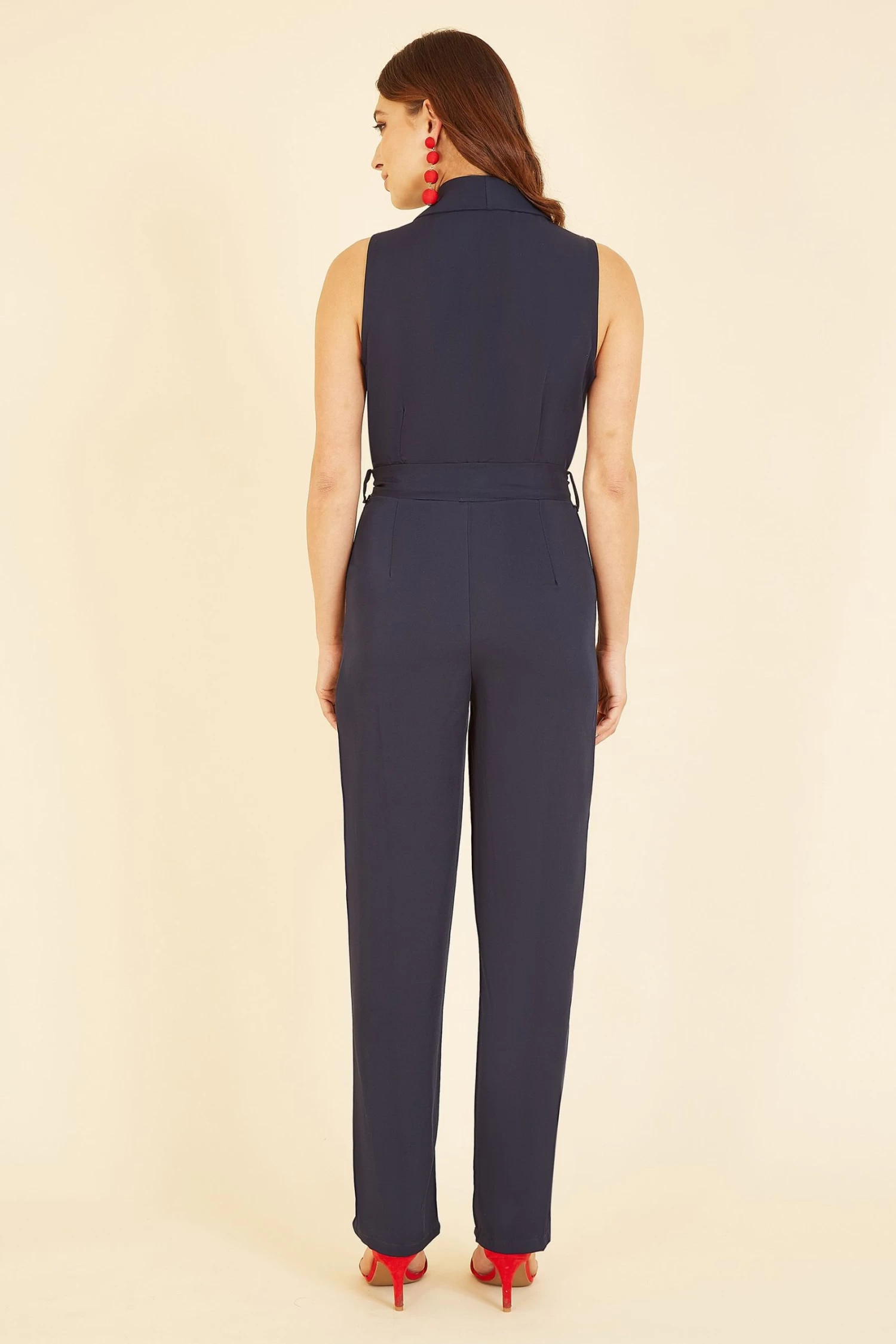 This sleek jumpsuit design from Yumi is the perfect way to dress to impress. The neckline is a lapel style wrap around design, which meets the self tie belt at the waist. The cigarette style pant will show off your shape, whilst still being a relaxed and comfortable fit, all in a satin fabric that adds an elevated feel to this piece.