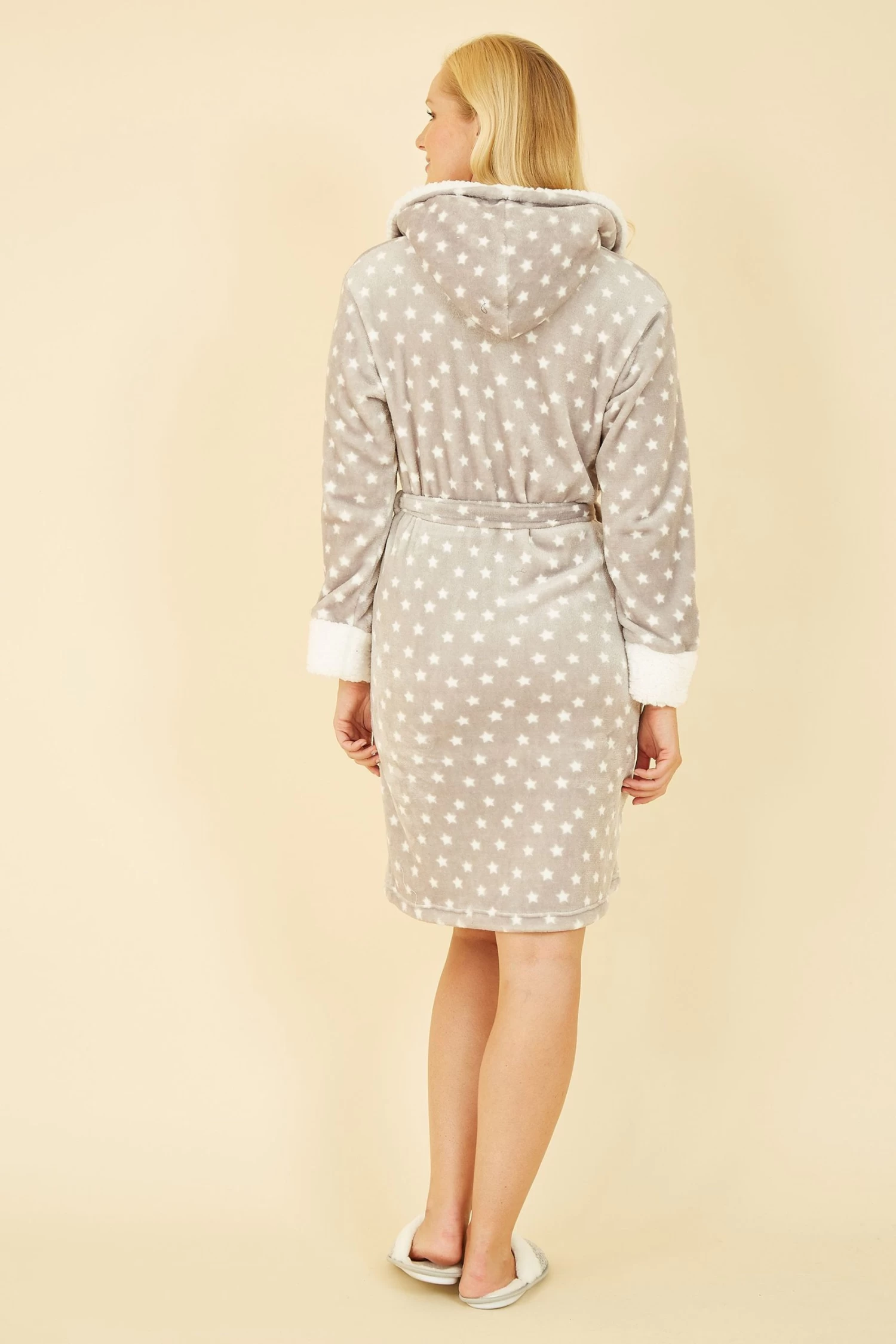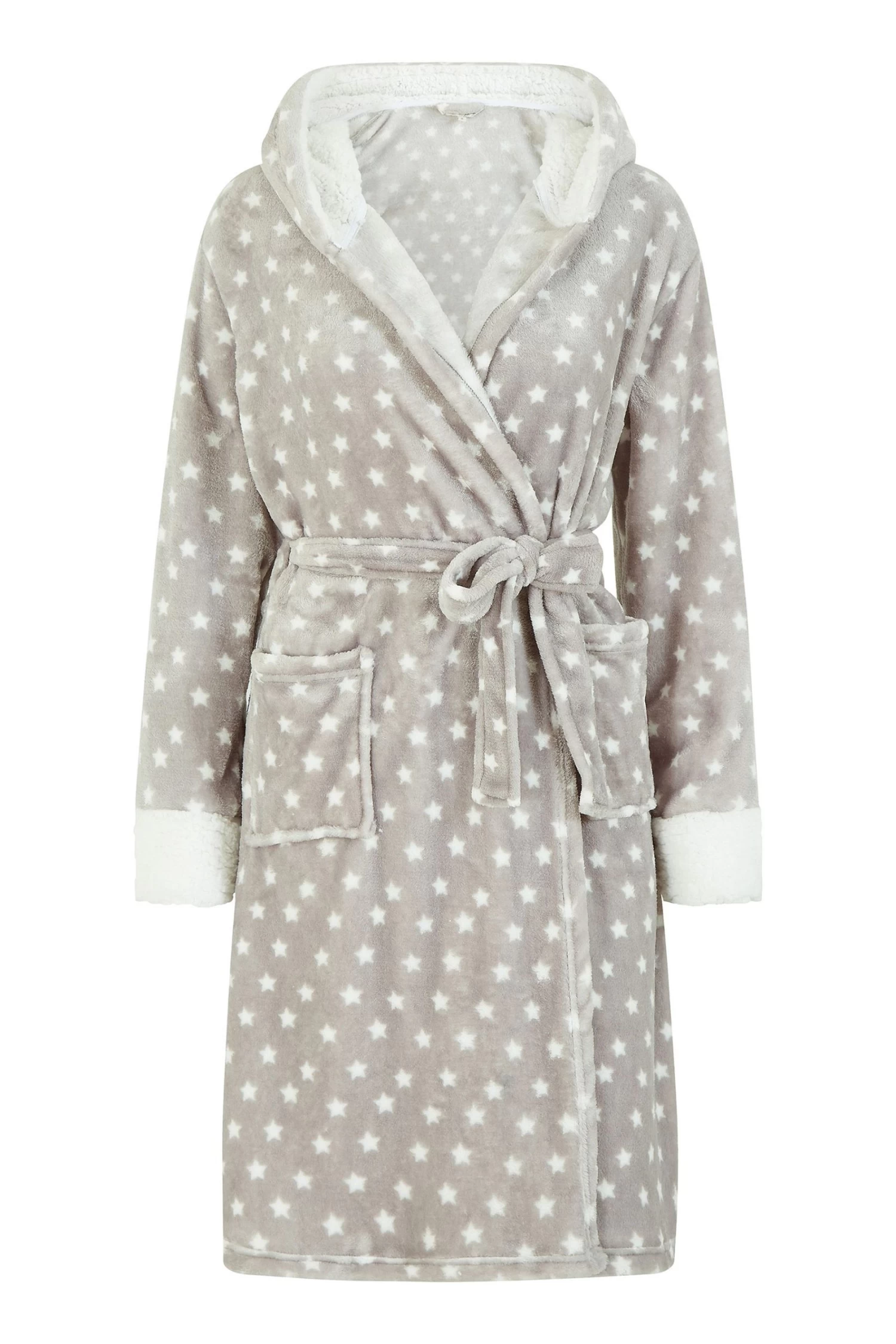 Perfect for snuggling on the sofa, this dressing gown is super soft and luxurious. Comes with a super cute grey and white star printed pattern, with fleece lining, cosy hood and waist tie belt.