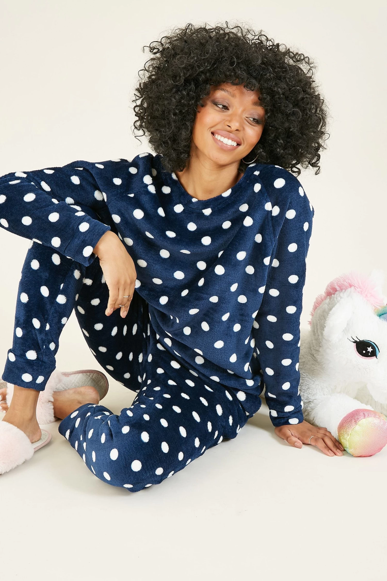The two piece you won t want to take off. This polka dot patterned navy two piece is crafted from super soft and cosy fleece material. Bottoms come with a skinny fit at the ankle. Perfect for snuggling on the sofa.